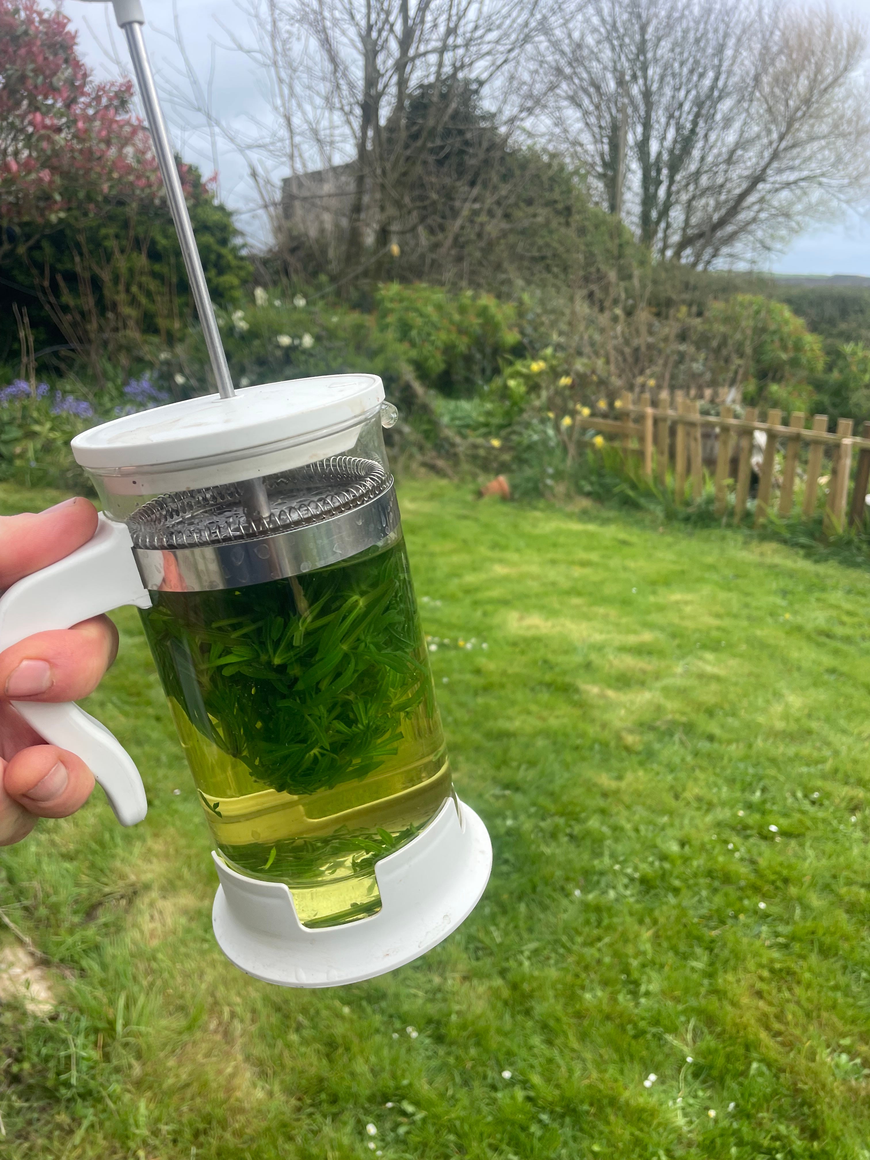 Which brings everything back around, literally, to the cyclical reality I was trying to feel my way into on the sofa. Because what I’ve been doing this week, out in that field, is something people on this island have done at exactly this point in the wheel of the year, for as long as there have been people here. I’ve been harvesting nettles to make a simple soup, and gathering the fresh new shoots of cleavers to make a tea.